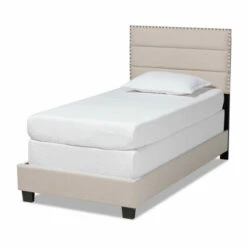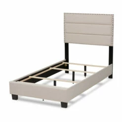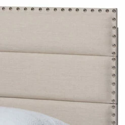 Anchor your bedroom in style and comfort with this gorgeous bed. Built with a sturdy wood frame, this piece is upholstered in a soft, foam-filled polyester fabric that provides ample comfort for you to rest against. Channel tufting adds a clean, modern look, while silver nailheads lend a touch of glamour.