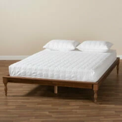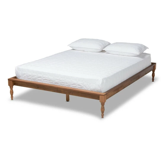 Bring the essence of classic Parisian design into your bedroom with this bed frame. Crafted from sturdy wood, this piece displays a warm walnut brown finish that complements any color palette. Its slatted platform provides solid mattress support, while turned legs lend a vintage French-inspired look.