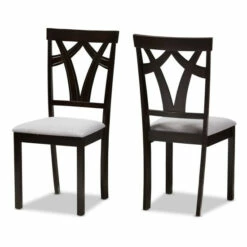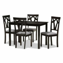 Bring contemporary charm to your living space with this Cyril 5-piece dining set from Copper Grove. The set includes one rectangular, MDF table with shaker legs, and four Rubberwood chairs. Each chair has a comfortable foam padded seat in your choice of grey or sand brown upholstery, and is embellished with a swooped V, crossback design that will complement the elegance of your space.