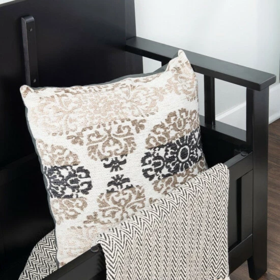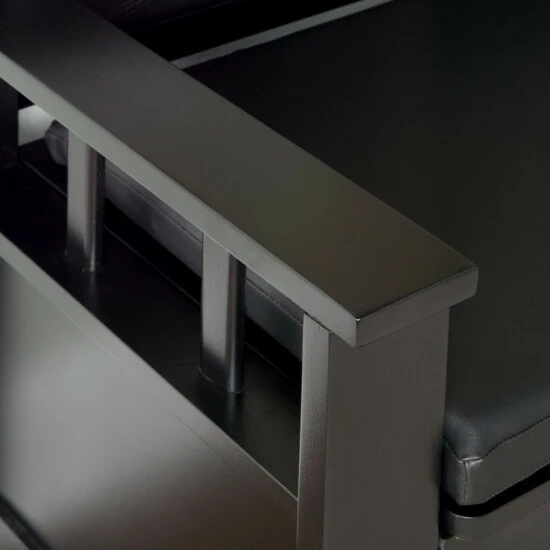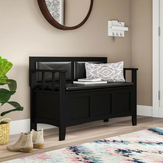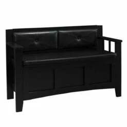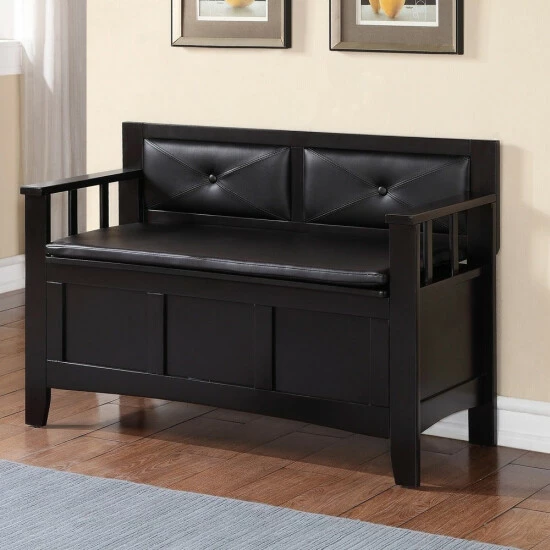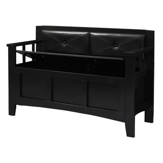 Perfect for a foyer or mudroom, this attractive padded storage bench offers comfy seating and spacious storage to any decor. A flip top lid opens to a generous storage compartment, while the black vinyl padded back and seat offer comfortable seating. The rich black finish easily complements any decor.