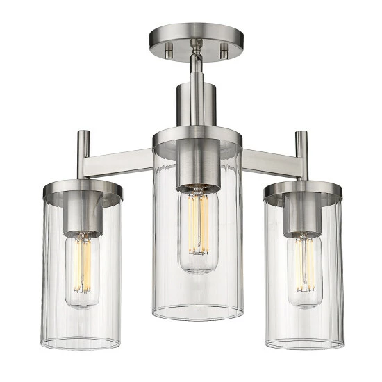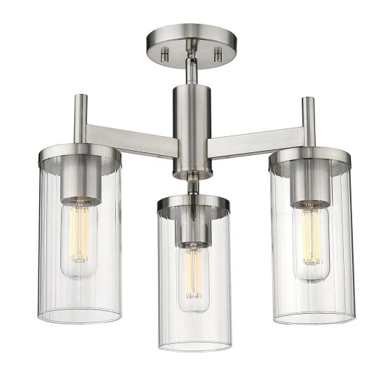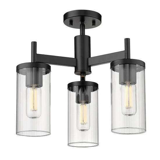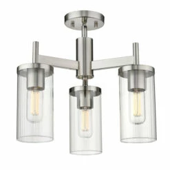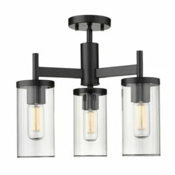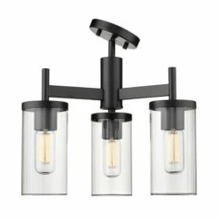This three-light ceiling fixture will add style as well as illumination to your room. The metal fixture comes in your choice of matte-black or pewter finish. The three lights are encased in clear glass shades with a unique, linear line pattern created by a glass-blowing technique.