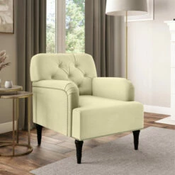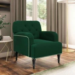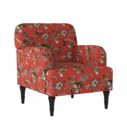 Whether added to your living room, den or office, this arm chair has a versatile transitional design that fits in perfectly just about anywhere. This diamond button-tufted chair is covered in a soft-to-the-touch velvet or a floral fabric with a timeless sensibility that will remain relevant over time and trends. Traditionally styled with a square back and saddle arms, the chair is detailed with hand-tacked pewter nail-head trim for a polished finish.