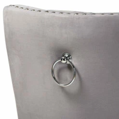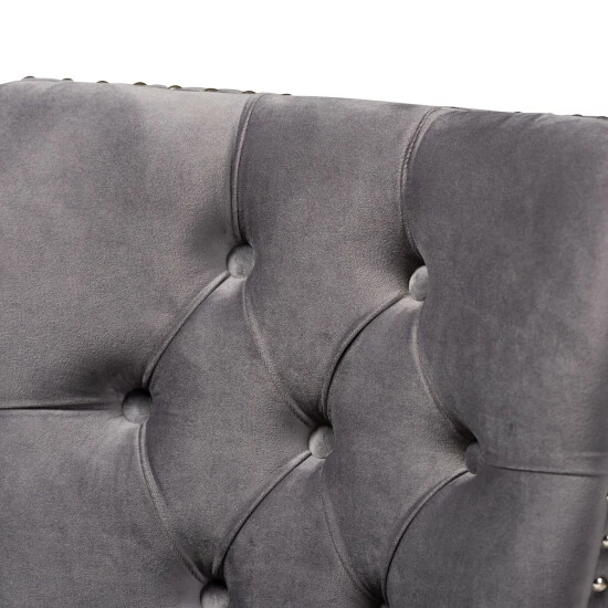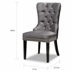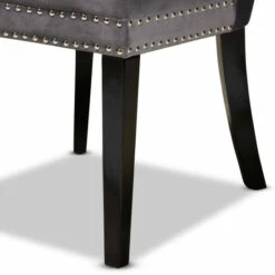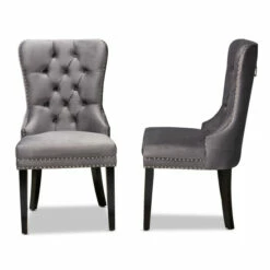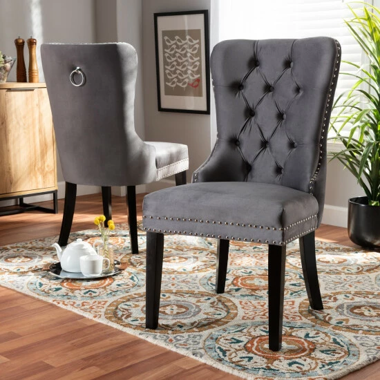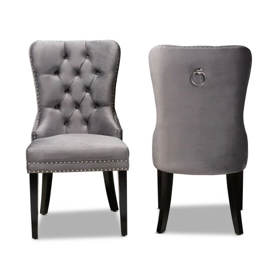 Give your dining room a makeover with the comfort and style of this two piece dining chair set. These high-back dining chairs feature supportive foam cushioning in the seat and back for reduced fatigue during meals or game night. Button tufting on each seat back and nailhead trim on the seat and back edges add a touch of upscale charm and character. Four solid wooden legs create a stable and supportive base without wobbling or rocking. Smooth velvet upholstery provides a soft and attractive finish.