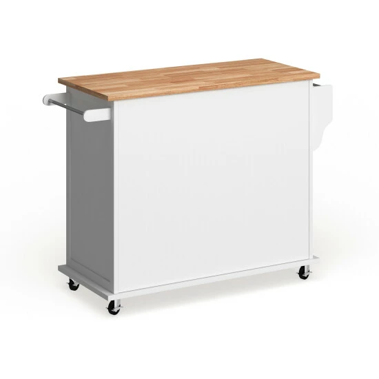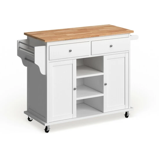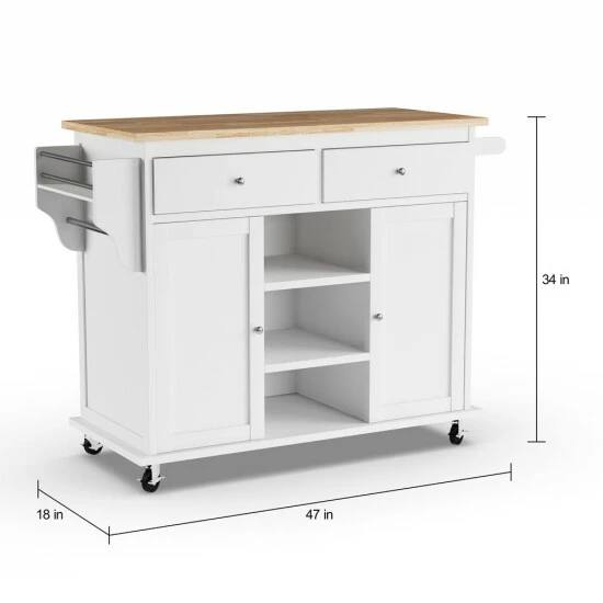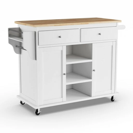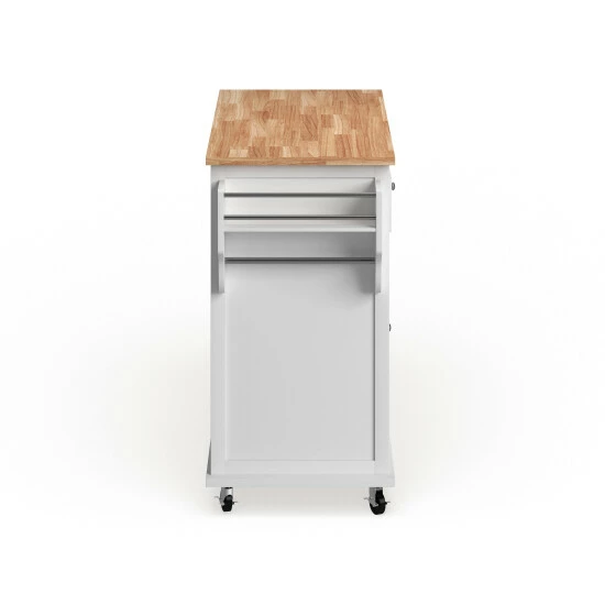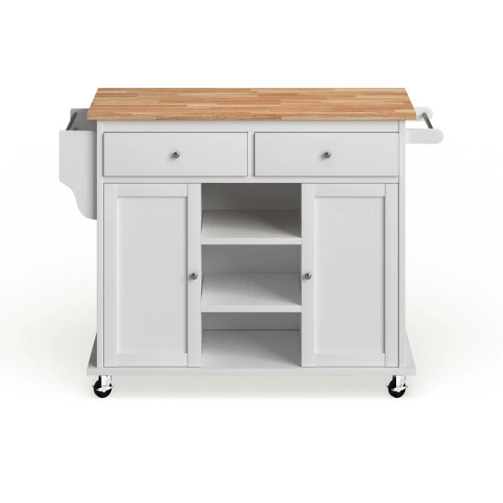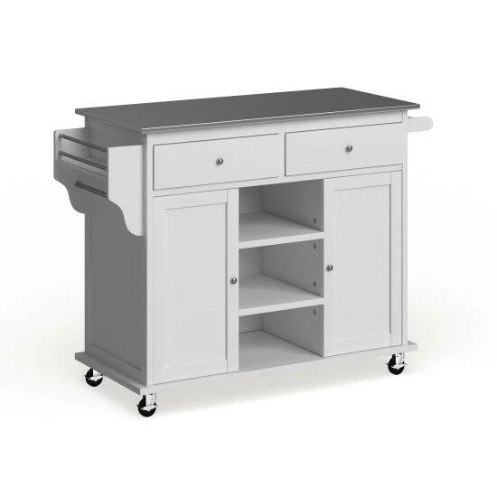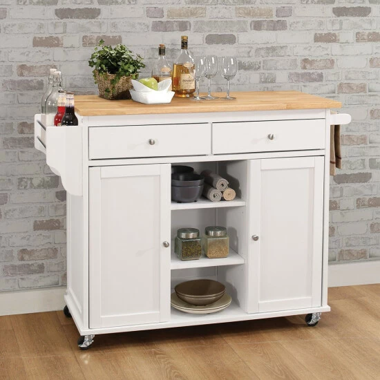 With just a pop of bright, cheery, pure white, coupled with your choice of a natural or steel top, makes this kitchen island rack a modern gem, indeed. This cart offers roomy drawers and an array of shelves to store all your culinary necessities, not to mention silvertone hardware and pulls.