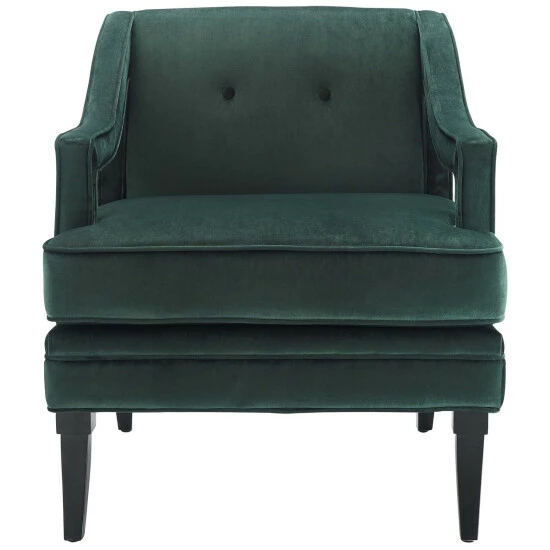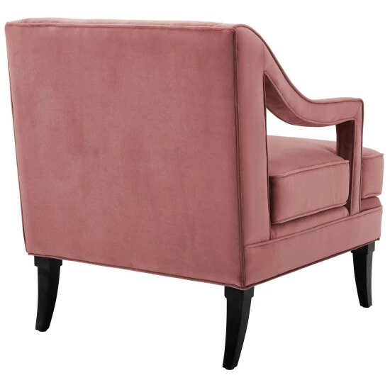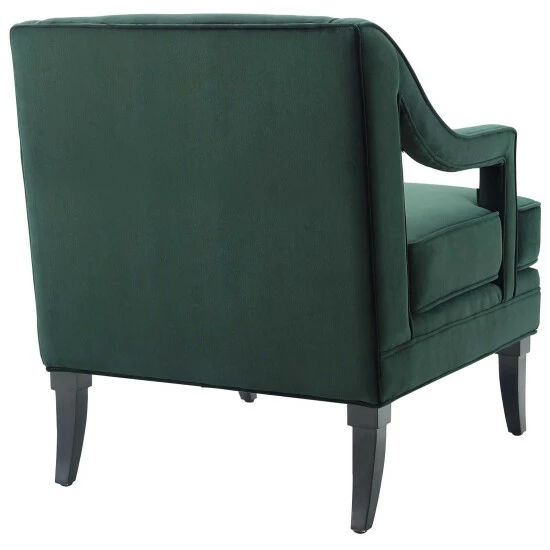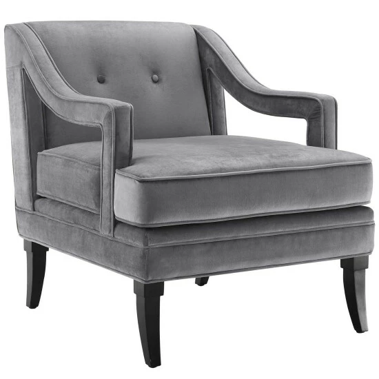 Elevate your home with the streamlined, chic cutout profile of this armchair. Upholstered in soft, stain-resistant velvet, it comes with a plush, 6” thick seat cushion, machine washable cover, and solid birch wood saber legs with non-marking foot caps. Adorned with sloping armrests, a tailored profile, and classic button tufting, this upholstered living room, accent or lounge chair makes a striking statement in a variety of modern and mid-century themed decors.