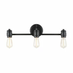 This three-light bath/vanity fixture features a beautiful matte black finish that will complement many urban and industrial decors throughout your home. The clean lines of the metal frame add interest while the exposed bulbs provide ample light to many bathroom spaces.