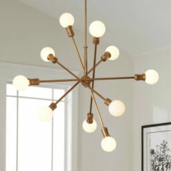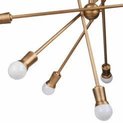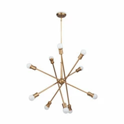 This collection 10-light chandelier features a natural brass finish that will complement many contemporary and modern decors. The fully adjustable and customizable arms add interest while exposed bulbs will provide ample lighting to any space. This Mid-Century rectangular chandelier features a sputnik design with adjustable arms allowing you to customize the light for just the right look. This piece includes 36 inches of stems and 83 inches wire so it can be hung at your desired height (Up to 87 inches). Dimensions: 49 inches high x 39 inch diameter. Turn on our fixtures, and watch your room transform even more.