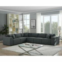 With a becoming construction worthy of contemporary, small-space living, this European-style modular sectional sofa is the perfect choice for you to entertain your guests in style and comfort! The low-back, thick seat cushions and arms, welt finish, and accent pillows are all features of this charming living room ensemble.