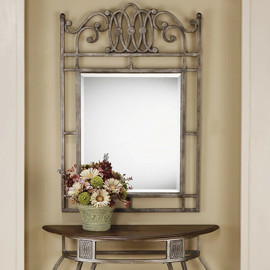 Elegance takes centerstage in the Copper Grove Ems Console Mirror. This beveled square mirror is framed by magnificent metalwork, featuring sweeping interlocking circles and complementary castings. And the beautiful Old Steel finish adds a touch of regency and sense of character to any room of your home.