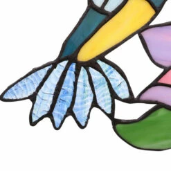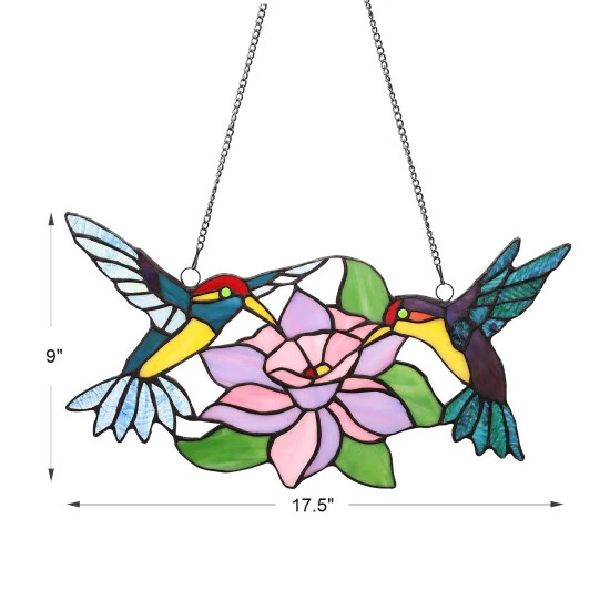 This Tiffany-style decorative stained glass panel will bring a splash of nature-inspired color to your space. Made using 77 pieces of stained glass and 2 glass beads, this piece depicts two hummingbirds feeding on the nectar of a beautiful flower. Hang this panel next to a window, on a wall, or from the ceiling.
