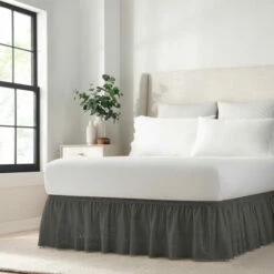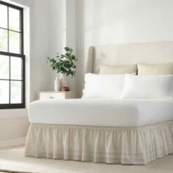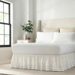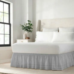 The clever yet stylish and unique elastic design of this bedskirt easily slips over your mattress and around your box spring, eliminating the need to lift the mattress in order to apply it. Your choice of vibrant colors, coupled with a quaint eyelet design, brings a cheerful country aesthetic to your bedroom.