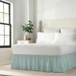 The clever yet stylish and unique elastic design of this bedskirt easily slips over your mattress and around your box spring, eliminating the need to lift the mattress in order to apply it. Your choice of vibrant colors, coupled with a quaint eyelet design, brings a cheerful country aesthetic to your bedroom.