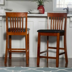 With a traditional Mission back styling, this Triena Craftsman Counter Stool will enhance your dining area with its casual charm. TheΒ rich dark cherry finish, dark brown wipe the clean vinyl padded seat, and 24-inch high seat give this bar stool a timeless allure. Solid construction and quality craftsmanship have made this counter stool both sturdy and attractive. This counter stool fits beautifully into a casual or formal dΓ©cor. 275-pound weight limit.Β