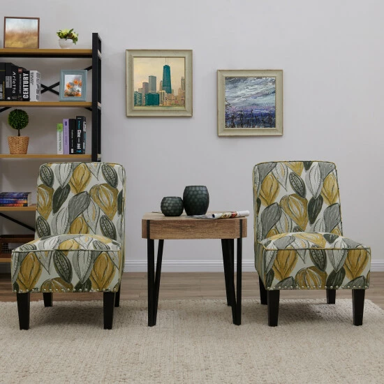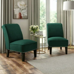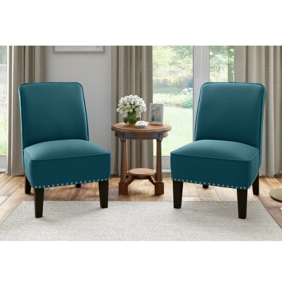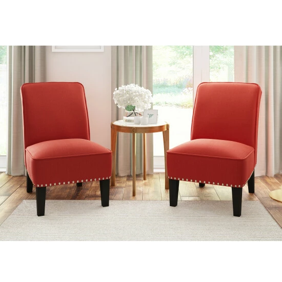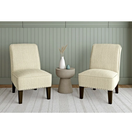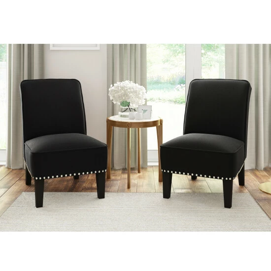The Genk set of 2 armless chairs boast a transitional style that allows for easy placement just about anywhere in your home. The small scale chairs feature a curved square back design with hand tacked pewter nail head trim and solid wood legs in a dark espresso finish that give theses chairs an elegant feel while providing extraordinary comfort.