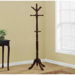 Complete the functionality of your home with this traditional style solid wood coat rack. A warm dark cherry finish completes the classic appeal of this triple tiered coat stand with 11 hanging pegs for your coats, hats, scarves, shawls, or sweater. The beautiful turned post anchored with a sturdy pedestal base brings plenty of stylish storage into your living space, making it easy to organize your entryway, hallway, bedroom, or office space.