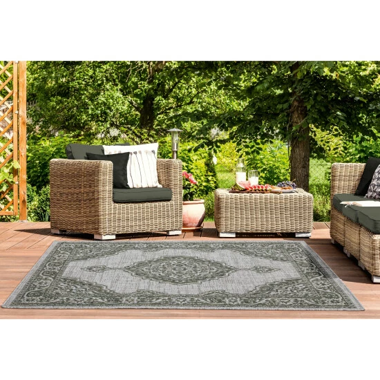 Provide a luxurious appeal to your interior or exterior design with this classic rug. This superb piece creates a beautiful affect by bringing out the intricate oriental pattern. This exquisite rug is made from 100% polypropylene for long-lasting durability and stain resistance to fit your lifestyle needs.