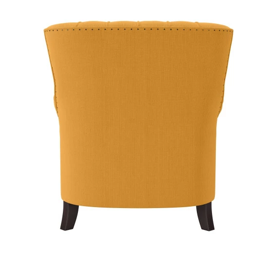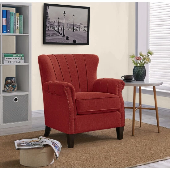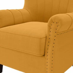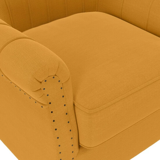 This arm chair features a squared channel tufted back design with a box seat cushion and boasts a classic rolled arm design adorned with hand-hammered exposed brads that reflect artisan tailoring that will compliment a variety of home styles.