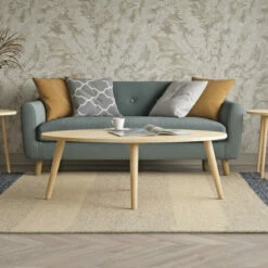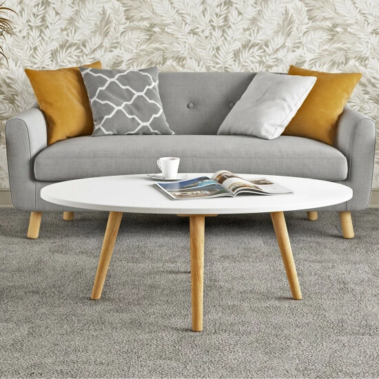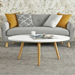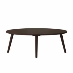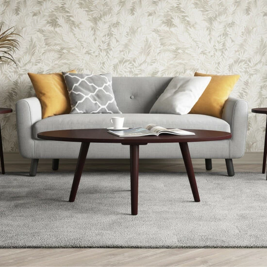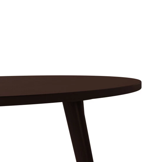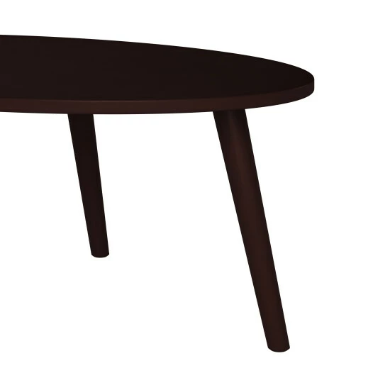 This cocktail table sports a classic style designed with a modern feel. The solid rubberwood table features an oval top and is complemented by round legs that flare out slightly. This table will add an updated look to your home.
