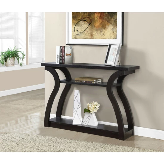Finish off your modern living area while maximizing the functionality of your home decor with this Copper Grove console table featuring a gracefully curved design and a deep cappuccino finish. Two bottom shelves along with the top surface offer ample display space for your decorative items.