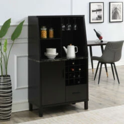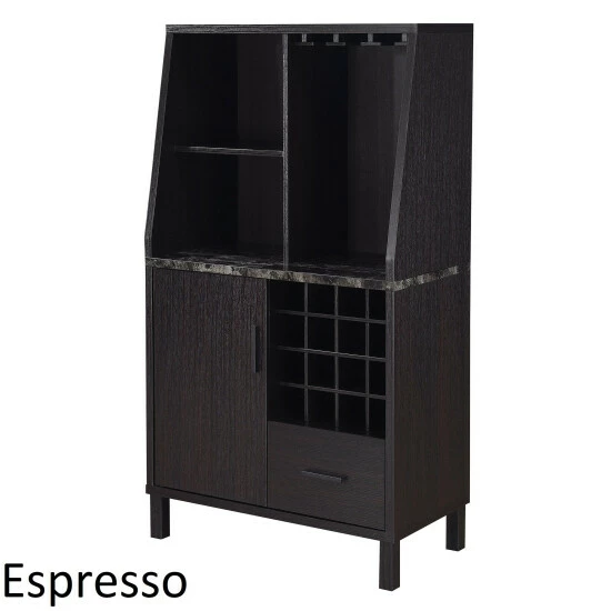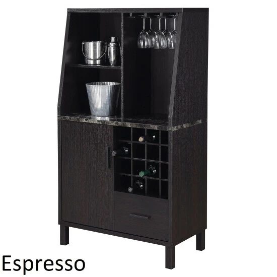 Unwind after a long day with the Copper Grove Helena 1 Drawer Wine Storage Bar with Storage Cabinet. This all in one unit has room for all your spirits and liquor essentials. It can hold up to 16 bottles of wine and has three wine glass racks. This bar also offers hidden storage; one cabinet with shelves inside and one spacious drawer with metal glides