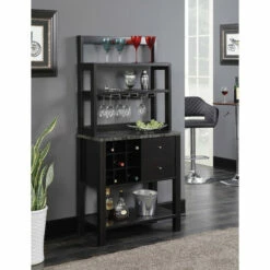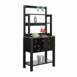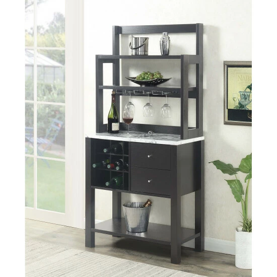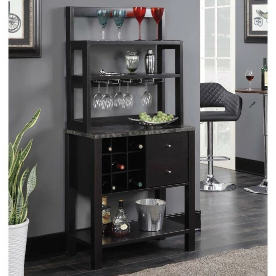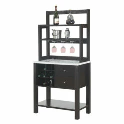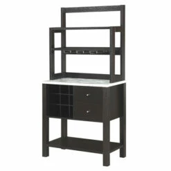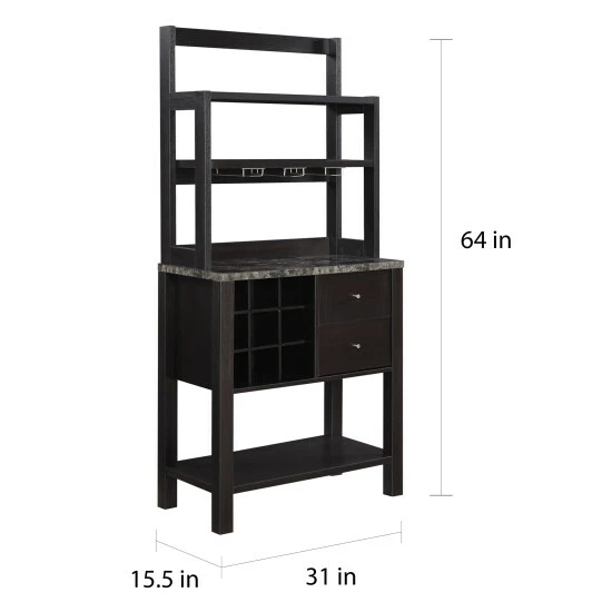 Upgrade your entertaining area with the Copper Grove Helena 2 Drawer Serving Bar with Wine Rack and Shelves. With a holding capacity of 9 wine bottles, you will have enough space for all your favorites. Including a total of 4 shelves, 3 top and 1 bottom, there is ample space for drink ware and must have beverages. In addition, this bar has 3 hanging stemware racks to accommodate your wine glasses. This modern contemporary piece includes two drawers that provide hidden storage to stow away your cocktail accessories. Cleanup is easy thanks to the faux marble serving top finished with melamine. Place in your living room, kitchen or dining room and enjoy its endless versatility.