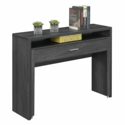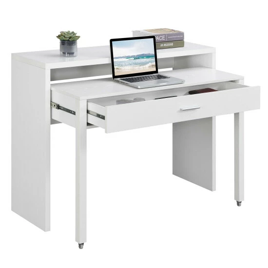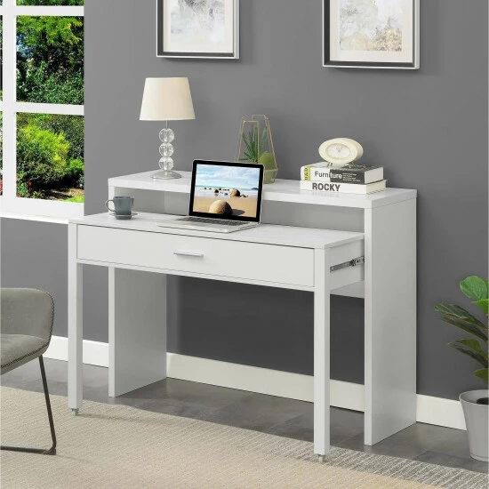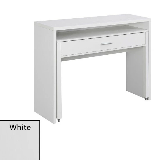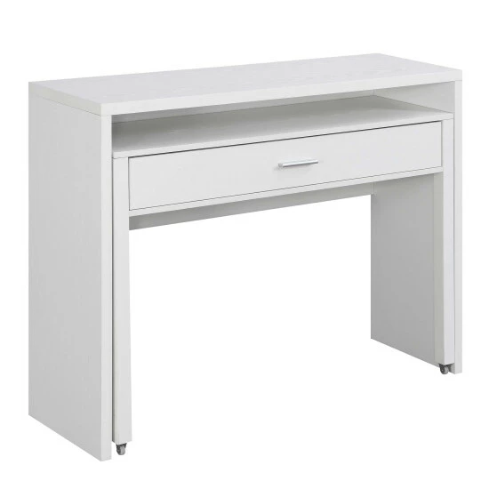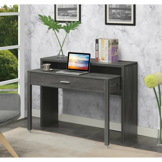 Slide on into your office with the Copper Grove Helena Console/Sliding Desk with Riser. This modern-style desk expands into two sections giving you the space needed to complete your work. The middle shelf offers double the workspace by easily sliding out thanks to the smooth ball-bearing slides and caster wheels. The top riser is perfect for a monitor or lamp while the second tier is great to store the keyboard, mouse, or laptop. The wide drawer, on ball-bearing slides, also offers additional storage for unsightly office supplies. When not in use, turn this desk into a console table by conveniently sliding the second tier under the top shelf for a clean compact look. Crafted from honeycomb and particleboard materials, this durable desk is sure to last.