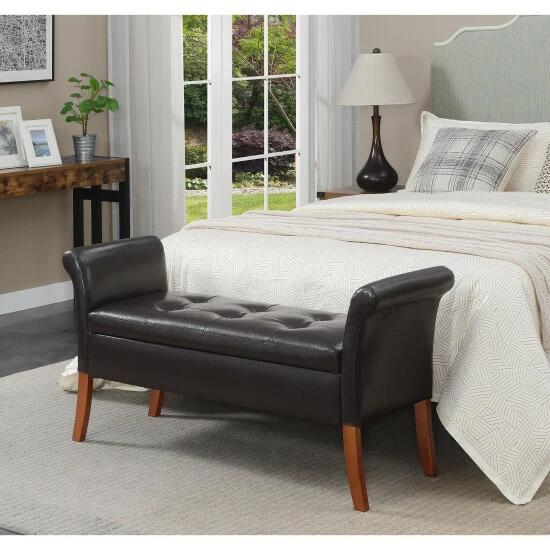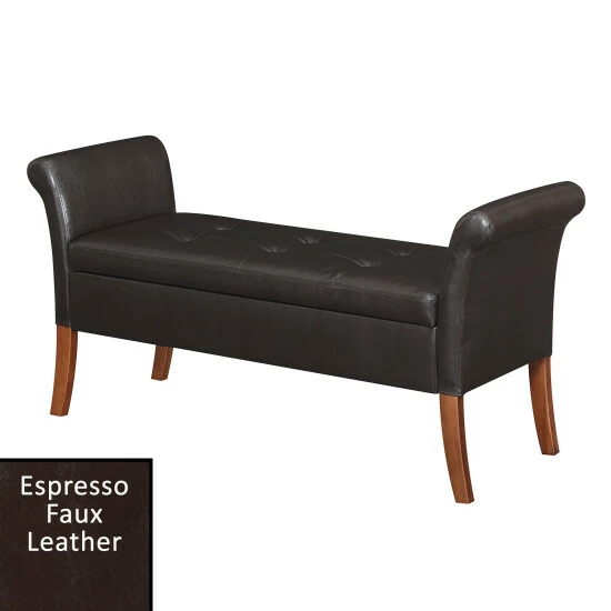 Complete any room in your home with the Copper Grove Helena Storage Bench. This multi-functioning bench doubles as extra seating and as a stylish storage unit. Use in the entryway to put on your shoes or display in the bedroom as a beautiful accent piece. Elegantly rolled armrests; fine stitching; and a sleek tufted seat add the perfect amount of luxury and sophistication to any room. This storage bench offers plenty of space to tuck away blankets; small pillows; and more. Pressure hinges allow for the lid to stay open on its own allowing for safe and easy access to accessories stored within the bench. This contemporary piece is upholstered in soft luxurious fabrics and filled with padded foam cushions for maximum comfort. The large frame is engineered from manufactured and solid wood while the sturdy legs are built from solid rubberwood. Assembly is simple with this beautiful piece arriving almost fully assembled and only the arms needing to be attached.