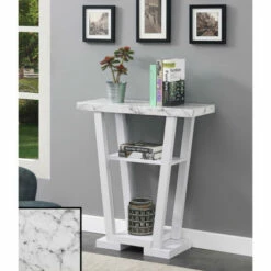 Style your entryway with the Copper Grove Helena V Console Table. The MDF, melamine, and particleboard frame features a v-shaped silhouette with two open shelves below the top. Choose from various finish color options to perfectly match your unique decor.