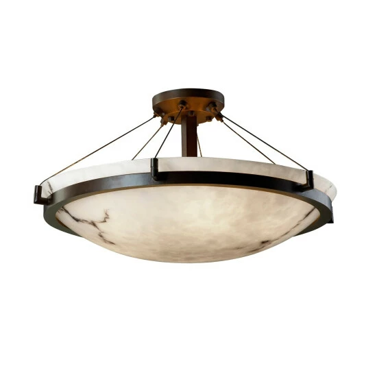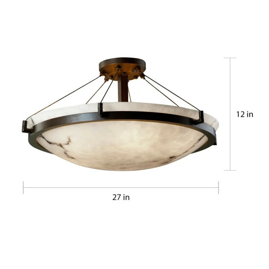 The Ring Round Bowl Semi Flush comes in a dark bronze finish with faux alabaster shade, this fixture is made of metal and faux alabaster resin materials; Requires six (6) 75-watt A-19 E26 medium base bulbs (not included).