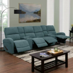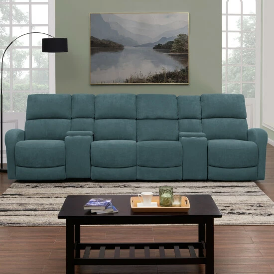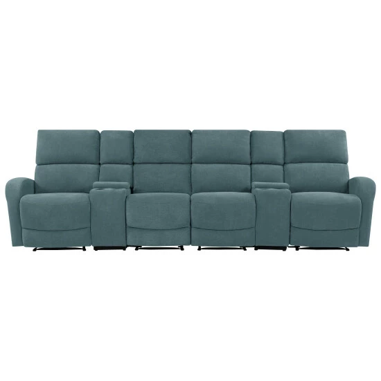 Update your home with this comfortable Copper Grove modular sofa that is covered in a medium blue chenille fabric. The six piece sofa recliner includes a left and right reclining arm seat, two armless center reclining seats and 2 center consoles that secure together through a button and slot connection on the frames so they will not slip apart. The recliner sofa features easy to open and reach handles for reclining on each end with cup holders, deep well storage 2 USB ports and 2 standard outlets in each center console that allows you to keep things conveniently close at hand but out of sight as well as to charge your electronic devices. This comfortable sofa is perfect for long-term sitting, TV viewing and relaxed reclining in theater, media and living rooms..