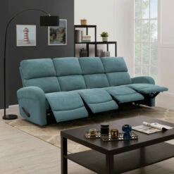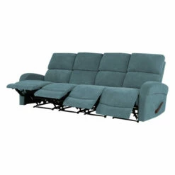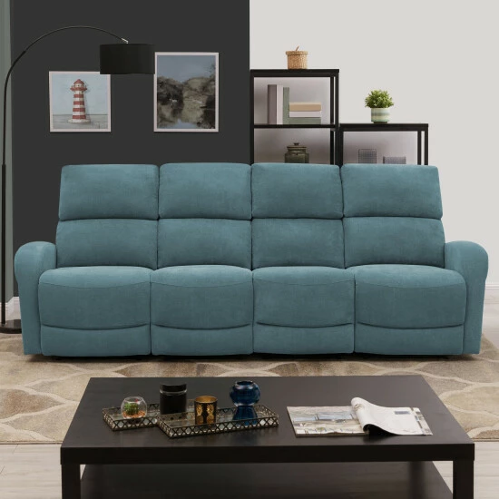 Update your home with this comfortable Copper Grove modular sofa that is covered in a medium blue chenille fabric. The four piece sofa recliner includes a left and right reclining arm seat and two armless center reclining seats that secure together through a button and slot connection on the frames so they will not slip apart. The recliner sofa features easy to open and reach handles for reclining on each end and parachute cords to recline the middle seats. This comfortable sofa is perfect for long-term sitting, TV viewing and relaxed reclining in theater, media and living rooms.