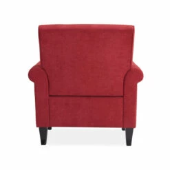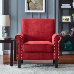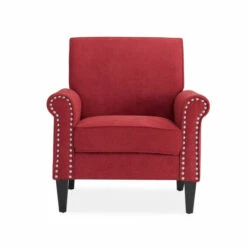 Accent your traditional or transitional home decor with this beautiful arm chair. Upholstered in brick-red velvet with a nailhead trim on the front of the arms, this chair is a centerpiece in any room. The plush foam seat cushion is supported by pocket coils and a sinuous spring seat deck for optimal comfort.