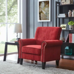 Accent your traditional or transitional home decor with this beautiful arm chair. Upholstered in brick-red velvet with a nailhead trim on the front of the arms, this chair is a centerpiece in any room. The plush foam seat cushion is supported by pocket coils and a sinuous spring seat deck for optimal comfort.