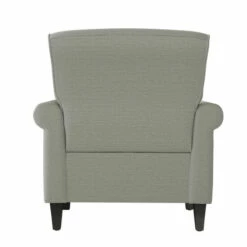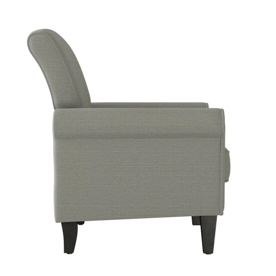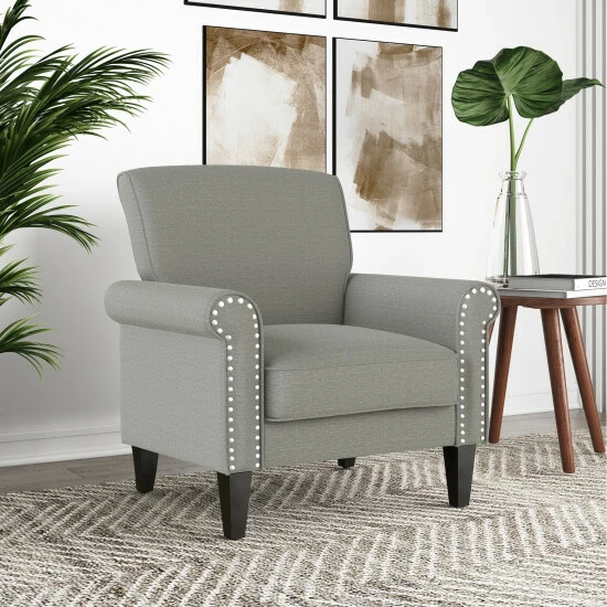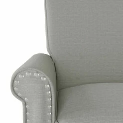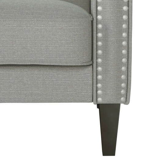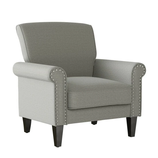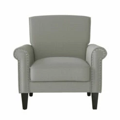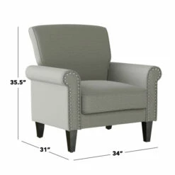 This inviting, cozy, and robust armchair is upholstered in a medium dove grey linen fabric. The chair features rolled arms, a square back, nailhead trim and is topped off with a dark espresso finish on its solid wooden tapered legs. Enjoy the traditional elegance of a distinctive silhouette that will be the perfect addition to a living room, bedroom, office or den.