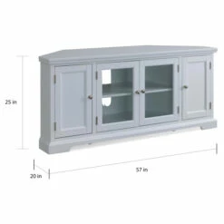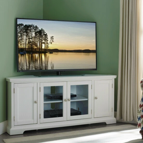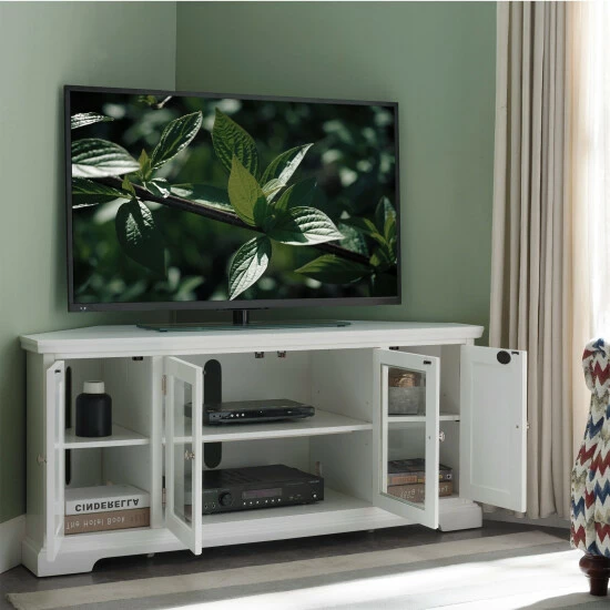 Make your living room more functional with this practical corner TV console. This piece offers adjustable shelving, managements slots, and closed cabinets to provide you with plenty of customizable storage space for all your digital devices, cables, and movie collections. The shape makes this TV stand ideal for use in a corner.