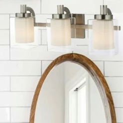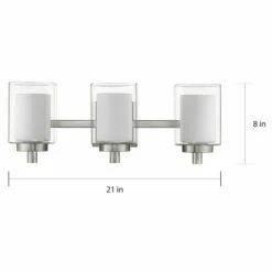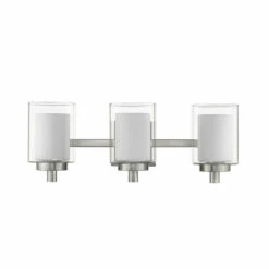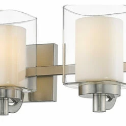 This fabulous piece offers a rectangular backplate and angular arms that give it a contemporary feel, while frosted cylindrical interior glass shades and clear square exterior glass shades create a layered vibe. Clean lines and a sleek satin finish make this double glass vanity a splash of modern style, providing just the right amount of light.