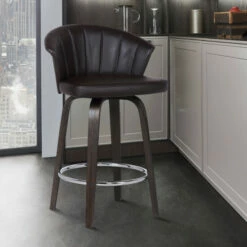 The Wood Back Swivel Faux Leather Bar Stool is a great fit into any contemporary or mid-century modern kitchen. The beautiful channel stitching on the inside of the back is accompanied by a walnut glazed wood on the outside. The is upholstered in faux leather and swivels for optimal function. The is available in two standard heights; 26″ and 30″. Β Β Β Included: 1 Stool Β Seat Material: Faux Leather Β Frame Material: Wood Β Swivel: Yes Β Seat Height: 26″ Counter Stool 30″ Bar Stool Β Color: Brown Β Assembly Required: Yes Β Note: Fabric color and saturation may vary due to lighting and monitor/phone screen settings Β Comes with standard 1-year limited warranty Β Product Dimensions: 22″W x 20″D x 39″H SH: 30″