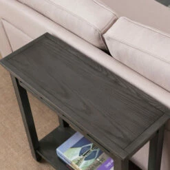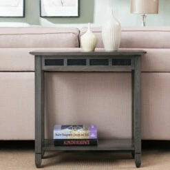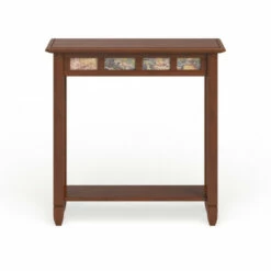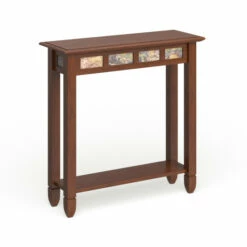 Simplicity and style come together with this rich brown decorative table.This rustic oak hall stand includes a lower shelf to add additional display space. Slate insets add natural texture to the table’s distressed oak-finished wood frame. With attractive running slate details and a sleek finish, this hall stand will add beauty to any room in the house.