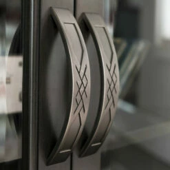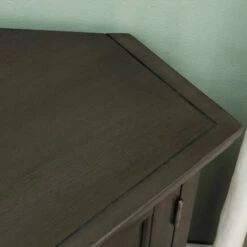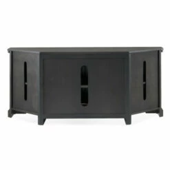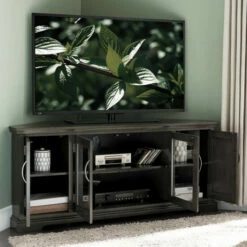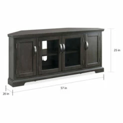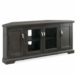 Add style to your room while taking advantage of your space with this entertainment console. The console is crafted from hardwood solids with grey oak veneers, and features a trapezoidal design that nestles neatly into the corner. Silvertone hardware on the solid and glass-panel doors lends elegance to the design, while adjustable shelves provide plenty of space for your media devices.