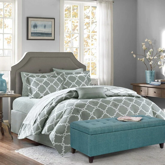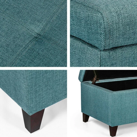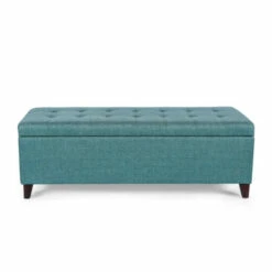 - Add to your home with this turquoise blue fabric storage ottoman bench. Β This ottoman will provide you with enough space to store your blankets and throw blankets. It is constructed with a sturdy corner-blocked frame and strong feet. A padded hinged lid stays open for safe access to storage inside great for your blanket and throw pillows.Β