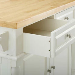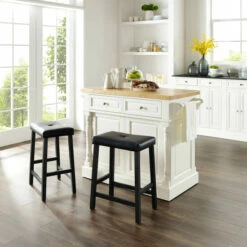 Transform your kitchen with this robust and lovely island. The butcher block top provides the perfect work space, and the accompanying stools allow for sitting up to a delicious meal or beverage.