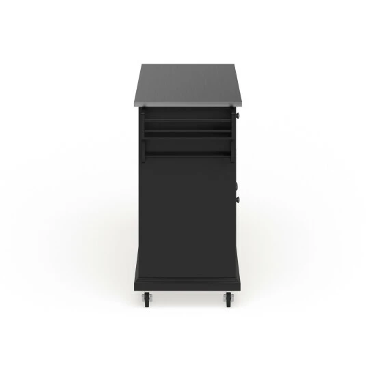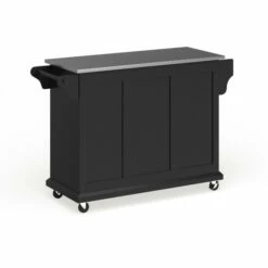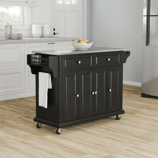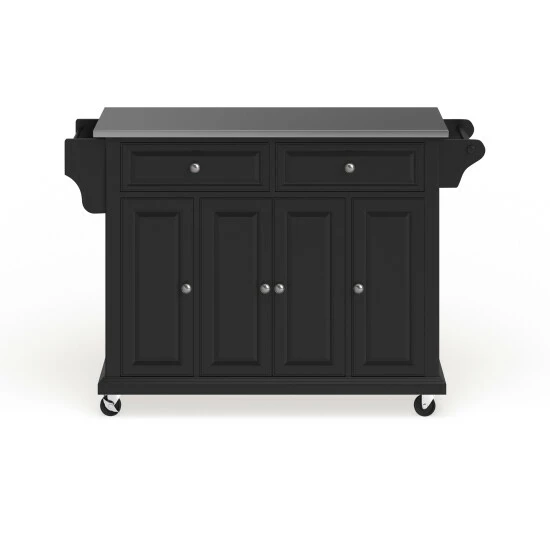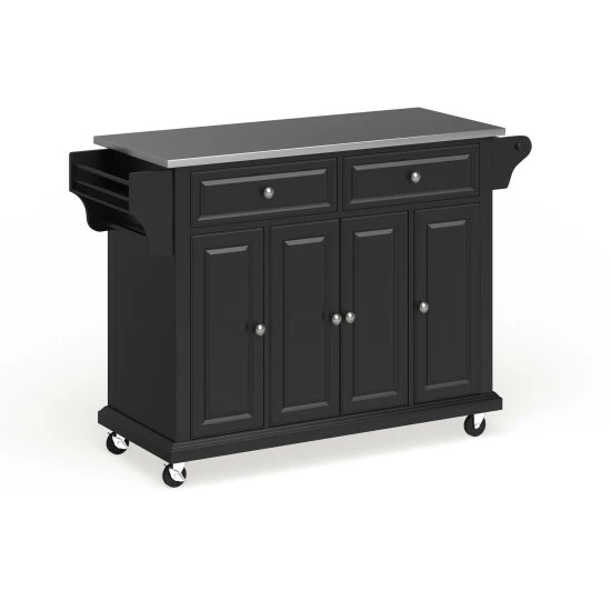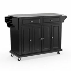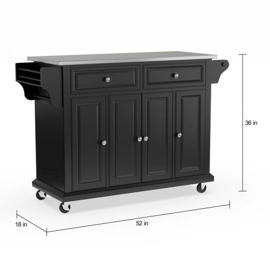 Incorporate extra functionality into your kitchen with this island cart made from wood with a stainless steel top surface. The drawers and cabinets give you room to store utensils and cookware, while the rolling casters make this cart mobile.