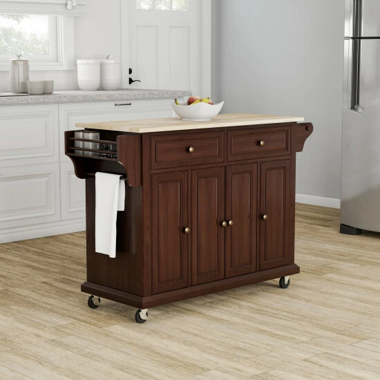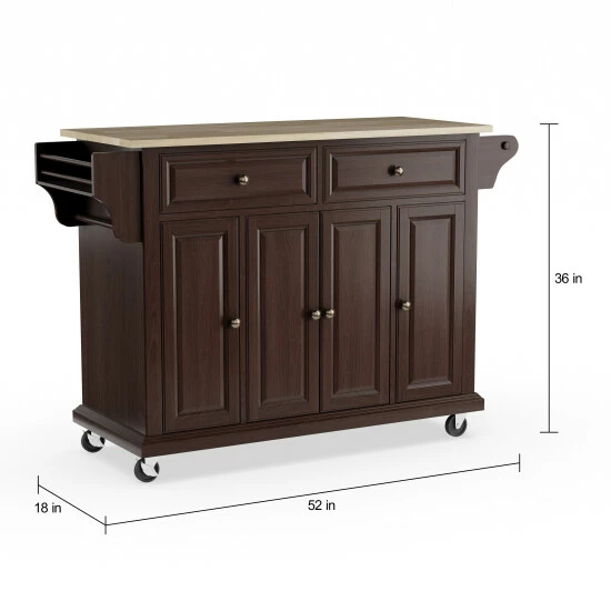 Handsome design and rugged construction coalesce in this robust and classic kitchen island. The abundant storage space is matched with a wood top for a resilient work space as elegant as it is functional.