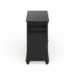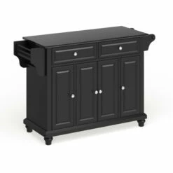 Update your kitchen with this sophisticated kitchen island. Featuring a rich satin black finish and a granite top, the island effortlessly complements any space with modern elegance. Two deep drawers are ideal for utensils, while the four doors open to reveal adjustable shelves and abundant storage space.