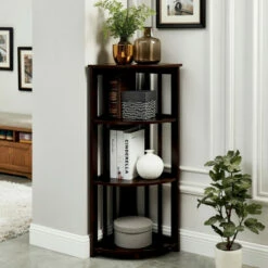 Display your books, vases, and decorative accents on the three open shelves and flat top of this corner bookshelf. Featuring a solid wood frame and dark walnut finish, this sturdy bookshelf perfectly complements your transitional style.