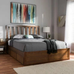 Upgrade your bedroom with this stylish contemporary storage platform bed. Built with a sturdy wooden frame and a warm walnut-brown finish, this bed’s headboard has a unique open, vertical slat design. Six drawers under the bed provide for plenty of convenient bedside storage.