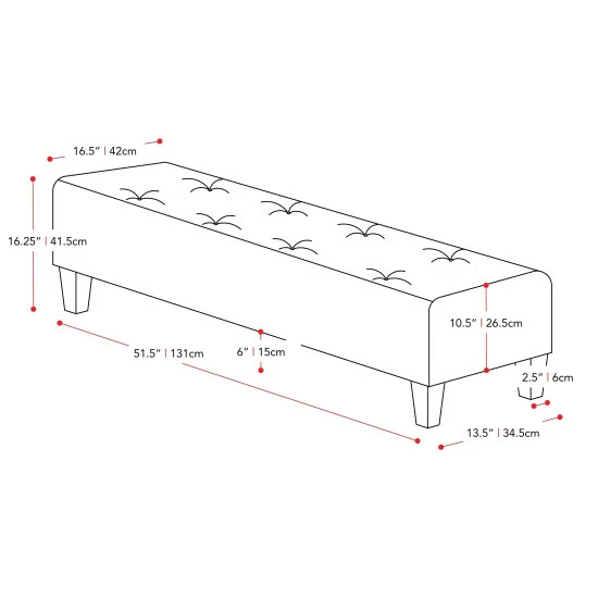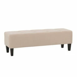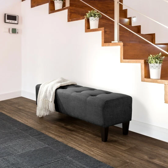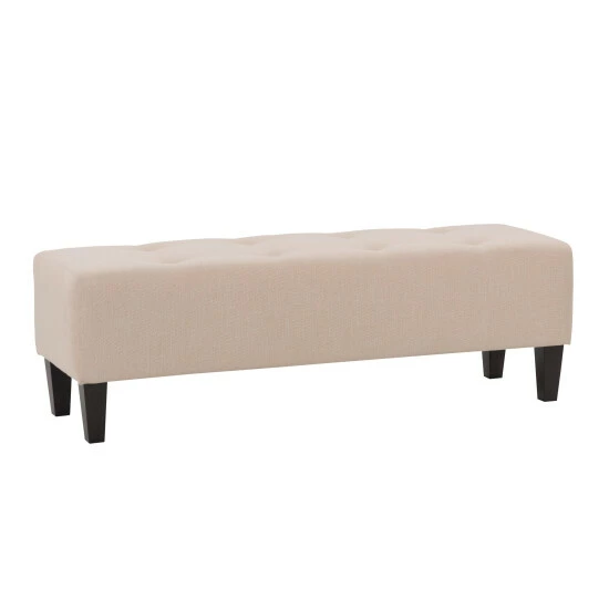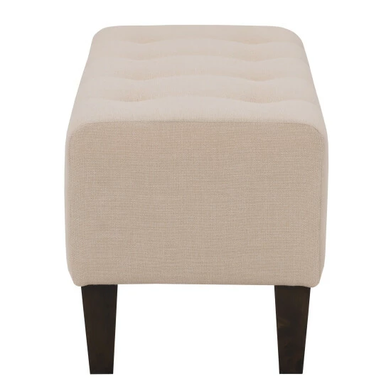 A trendy, yet versatile design – this bench completes the look for any entryway or bedroom space. Beautifully wrapped in a soft fabric, the comfortable seat cushion is home to gorgeous, symmetrical button-tufted detailing with a unique, seamless design. Sturdy, tapered accent legs are finished in a dark espresso stain that will complement any room’s decor.