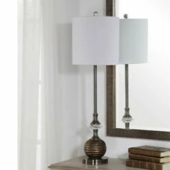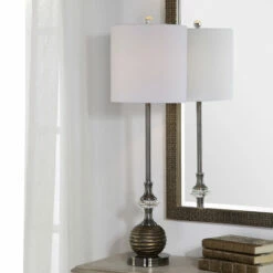 Soak up the glamour and functionality of this eye-catching table lamp. A textured bronze sphere highlights the brushed nickel and crystal accents. The drum hardback shade is a white linen fabric with light slubbing, for a crisp and clean vibe that’s sure to please your friends and family.