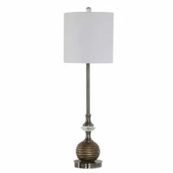 Soak up the glamour and functionality of this eye-catching table lamp. A textured bronze sphere highlights the brushed nickel and crystal accents. The drum hardback shade is a white linen fabric with light slubbing, for a crisp and clean vibe that’s sure to please your friends and family.