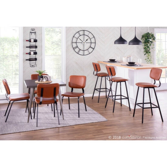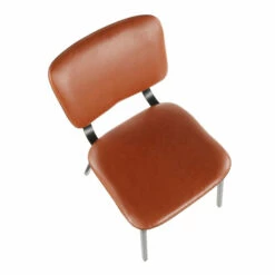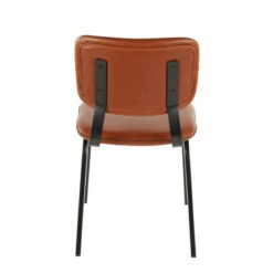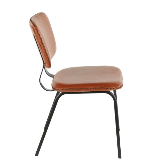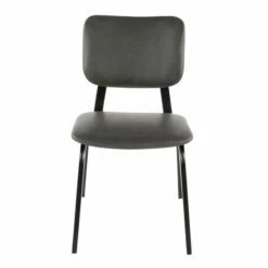 A contemporary take on a classic design, this pair of chairs features a curved backrest, comfortable seat, and black metal stationary legs. Upholstered in a luxurious faux leather with contrasting stitching, these chairs are available in a variety of color options, sure to fit your space.